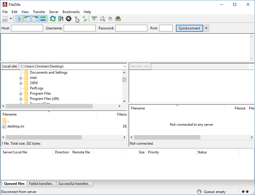 Once you have installed and opened FileZilla, you will be shown the screen like below