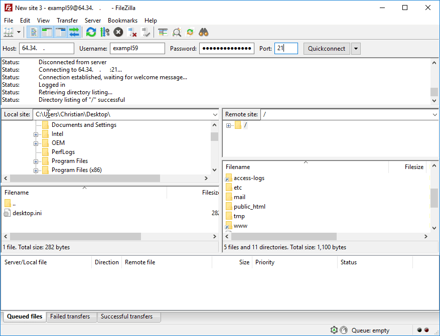 You are now logged into your FTP server! Your FileZilla should now look like below;