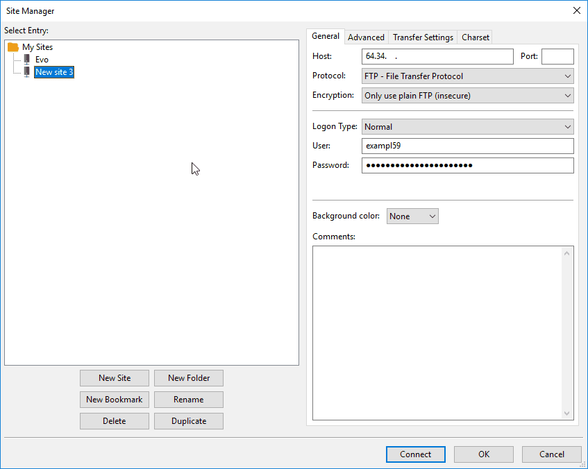 Set encryption in the drop down menu to Only use plain FTP (insecure). Please note – Some providers are picky and won’t let you use secure FTP’ing or vice versa. In that case, you might need to pick the other option which for this guide would be to use Require explicit FTP over TLS.